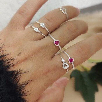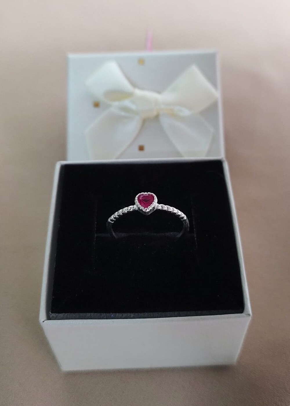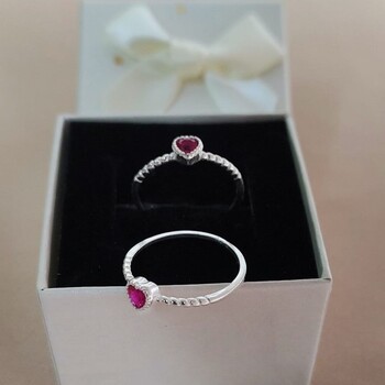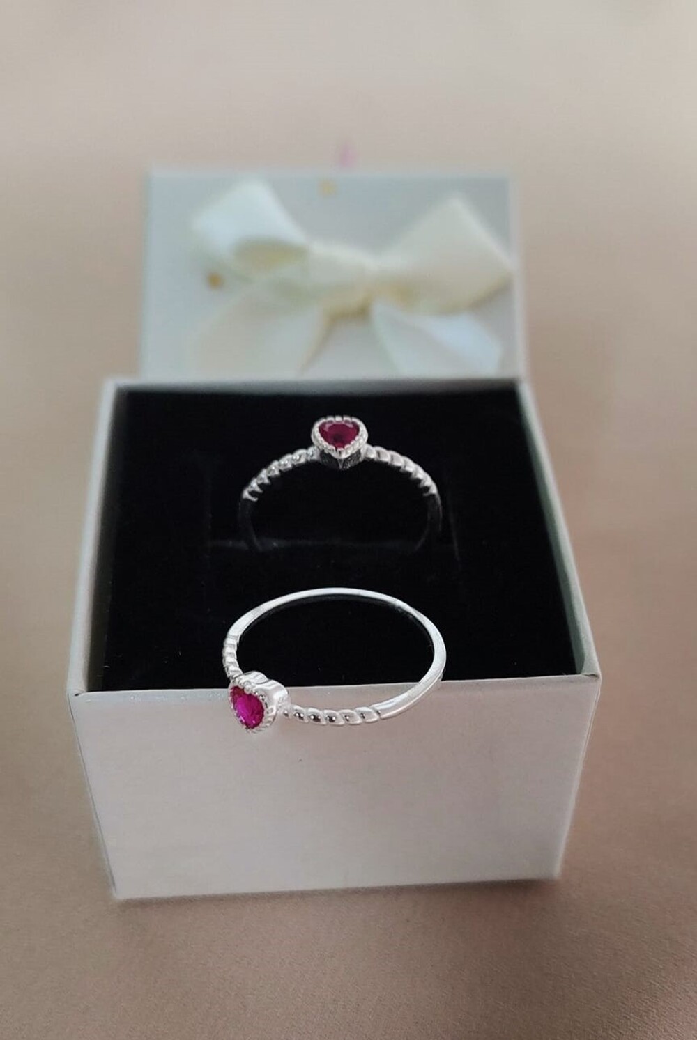 Anel aro fino estilo solitário de coraçao com pedra zirconia rubi na Prata 925.